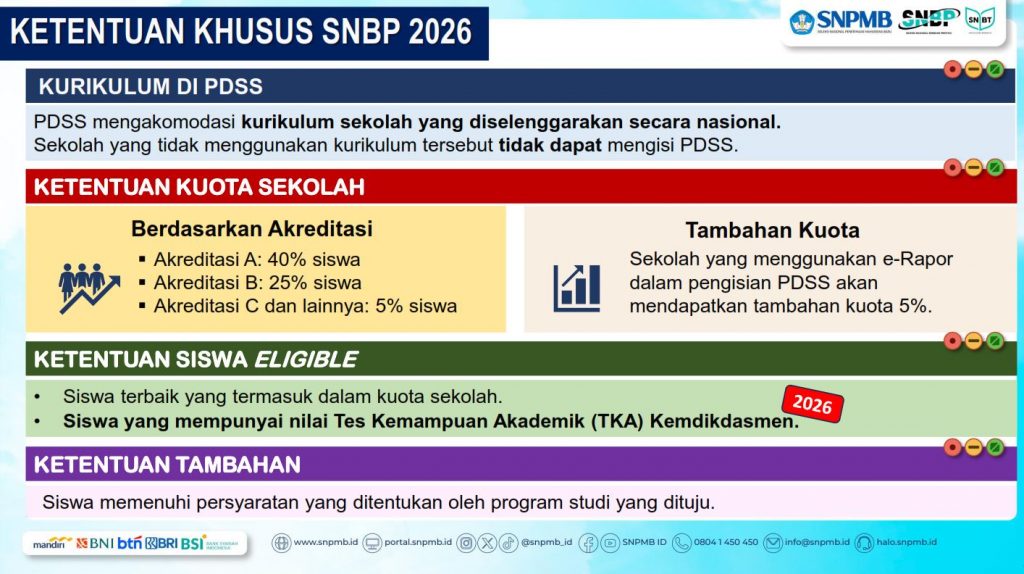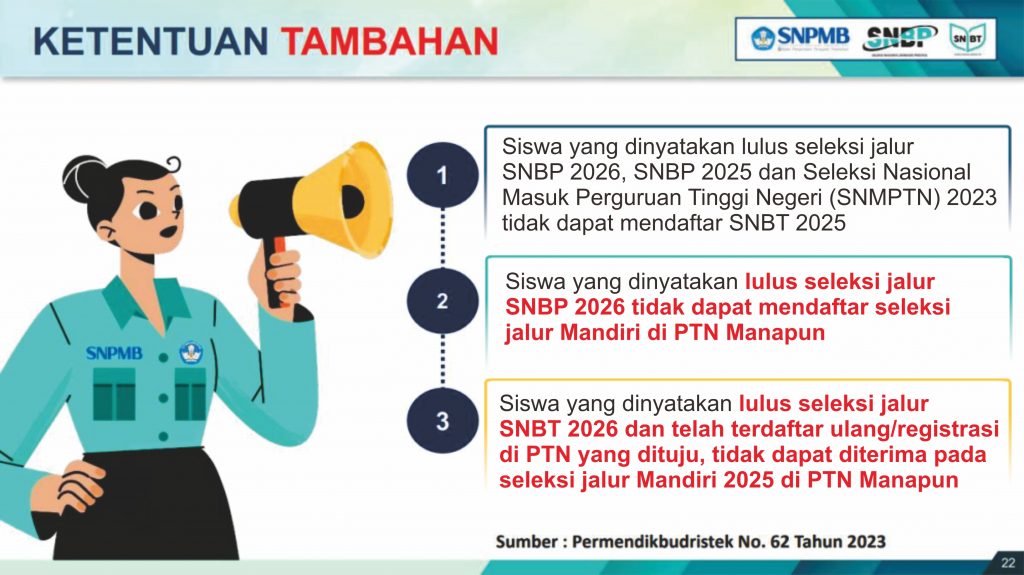 - Siswa yang dinyatakan lulus seleksi Jalur SNBP 2026 tidak dapat mengikuti seleksi Jalur Mandiri di PTN manapun.