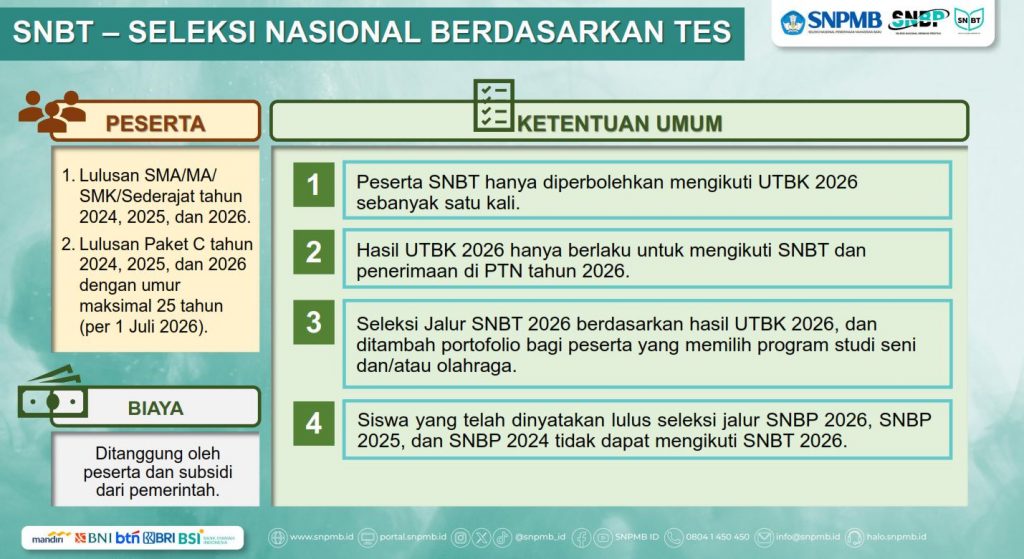 - SNBT 2026 dilakukan berdasarkan hasil UTBK dan dapat ditambah dengan kriteria lain sesuai dengan ketentuan khusus yang ditetapkan oleh PTN yang dituju.