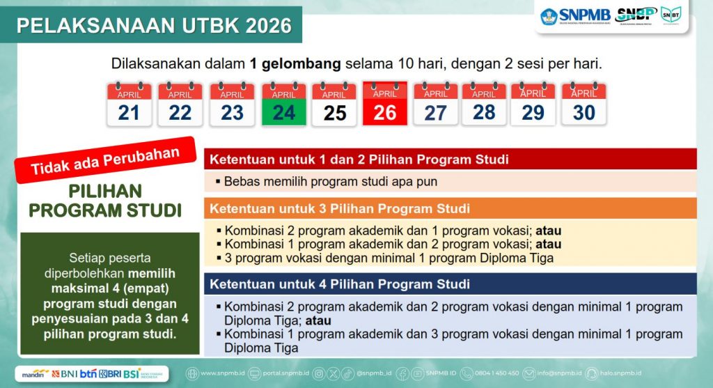 - Peserta SNBT hanya diperbolehkan mengikuti UTBK 2026 sebanyak satu kali.