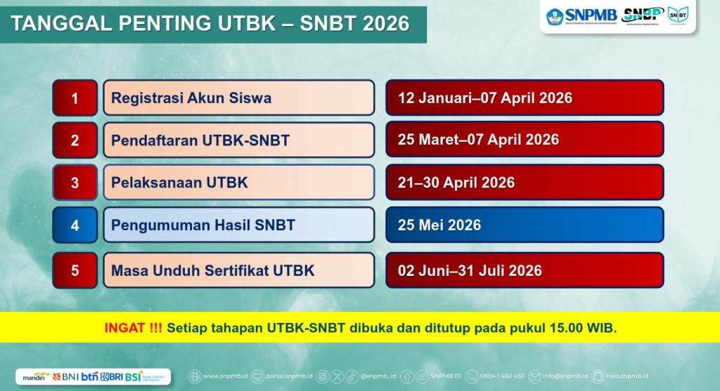 - Siswa yang telah dinyatakan lulus seleksi Jalur SNBP 2026, SNBP 2025 dan Seleksi Nasional Masuk Perguruan Tinggi Negeri (SNMPTN) 2024 tidak dapat mengikuti UTBK-SNBT 2026.